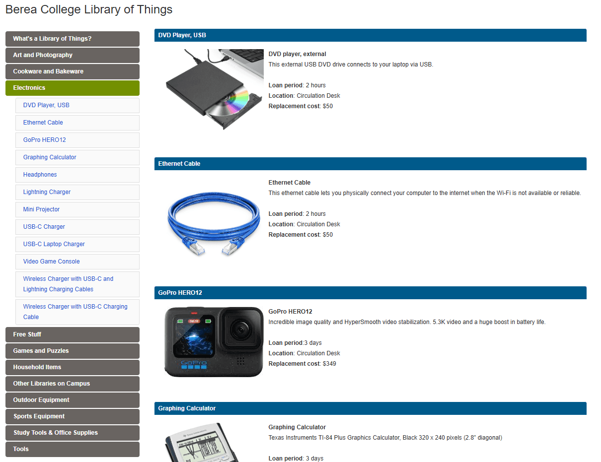 The idea of a “library of things” has gained popularity in recent years, with many public libraries implementing the concept. A library of things is a collection of tools, sports equipment, cookware, games, and other items that library patrons can check out and return just as they would a book. Creating a library of things for Berea at Hutchins was first suggested by Maria Taylor, Open Educational Resources Librarian. “There are so many resources available for students, but there were still some gaps,” Maria said. “The Library of Things is one way that we can address some of those gaps by providing items that support well-being, creativity, learning, and community in a sustainable way.” The Library of Things began by asking for suggestions from students about what sort of things they’d like to be able to borrow. “As more students learn about it, we continue to receive requests. Plus, we’ve created a webpage listing the items in the collection as well as items available for students from other departments on campus,” she said. “We hope that it will continue to evolve over time with student input.”